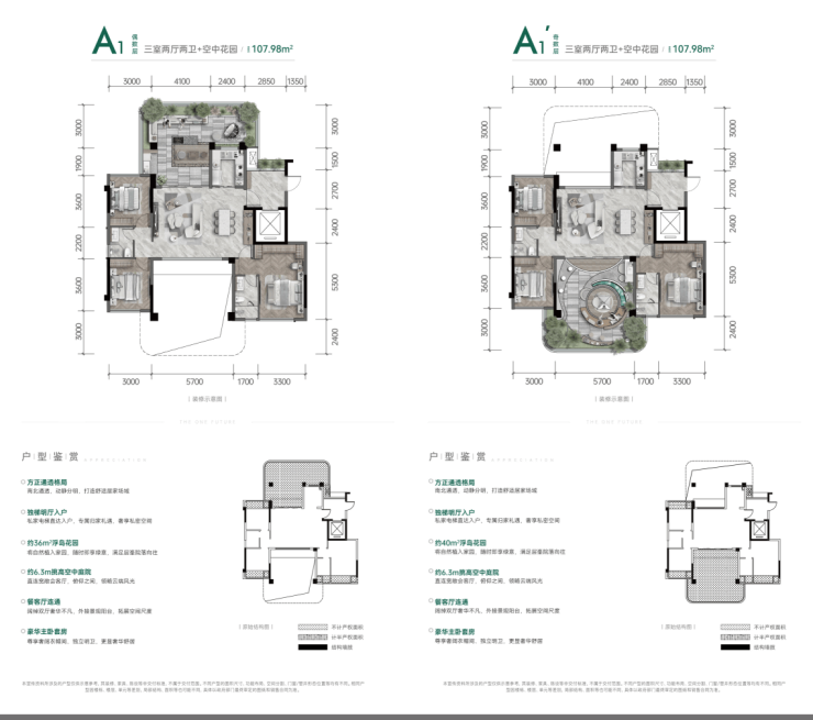 A1户型:建面107.98㎡,实得面积159㎡,