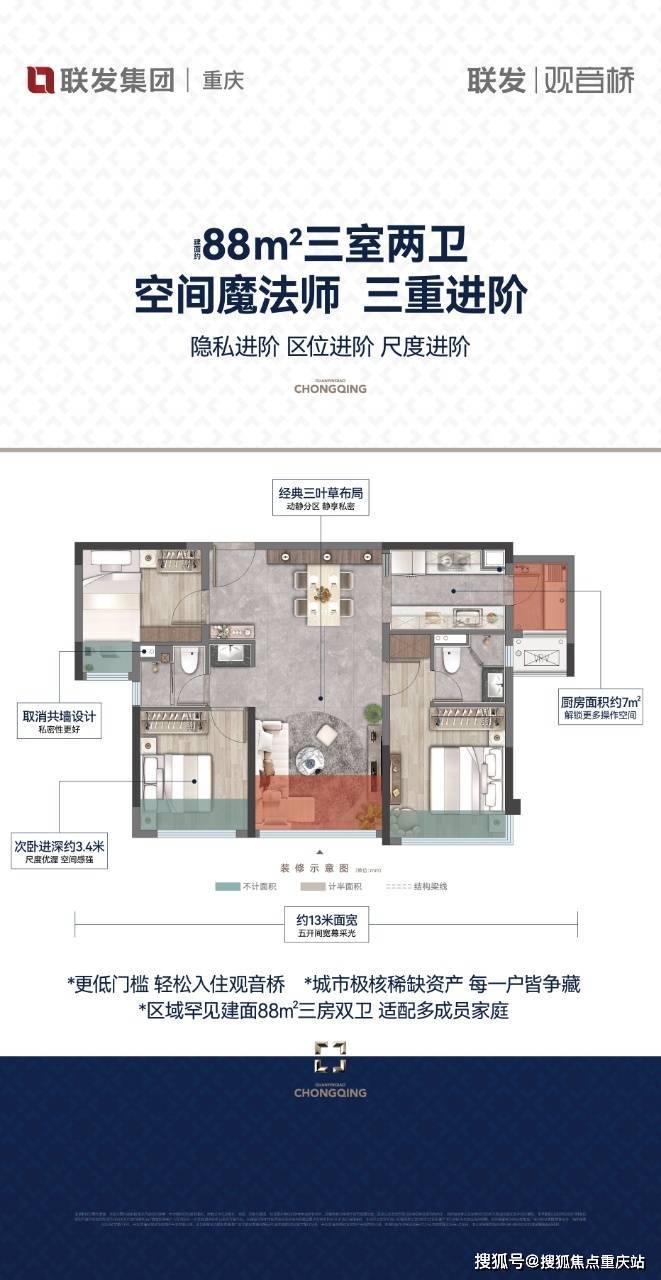 建面: 88/99㎡精装三房