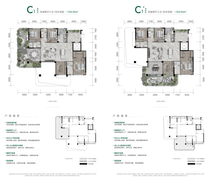 C1户型:建面143.24㎡,实得面积217㎡,