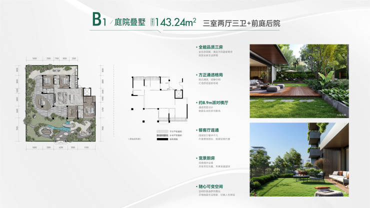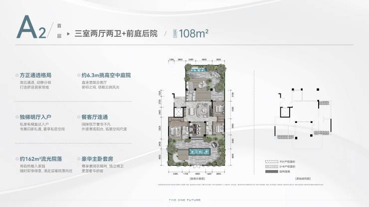 1、一梯一户一独院,前庭后院,超大赠送入户花园,赠送户均约40-50㎡6.3米空中庭院,层高3.15米;