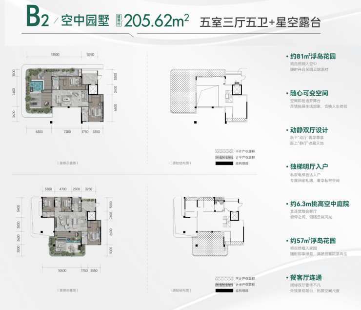 顶跃户型166-173-206㎡,实得290-380㎡,
