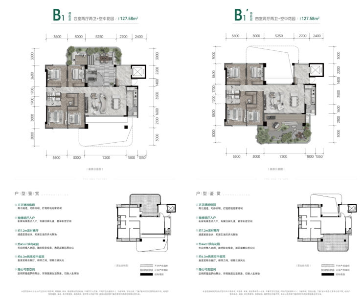 B1户型:建面127.58m²,实得面积199㎡,