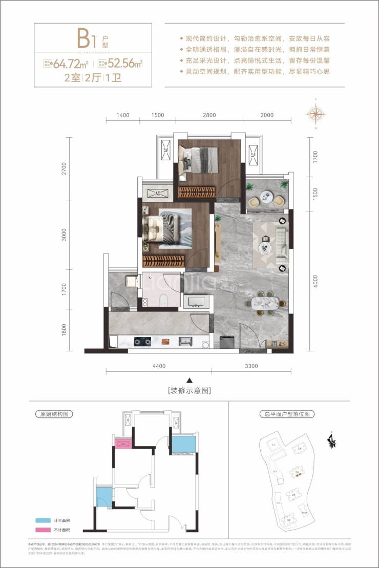 建面约64平套二