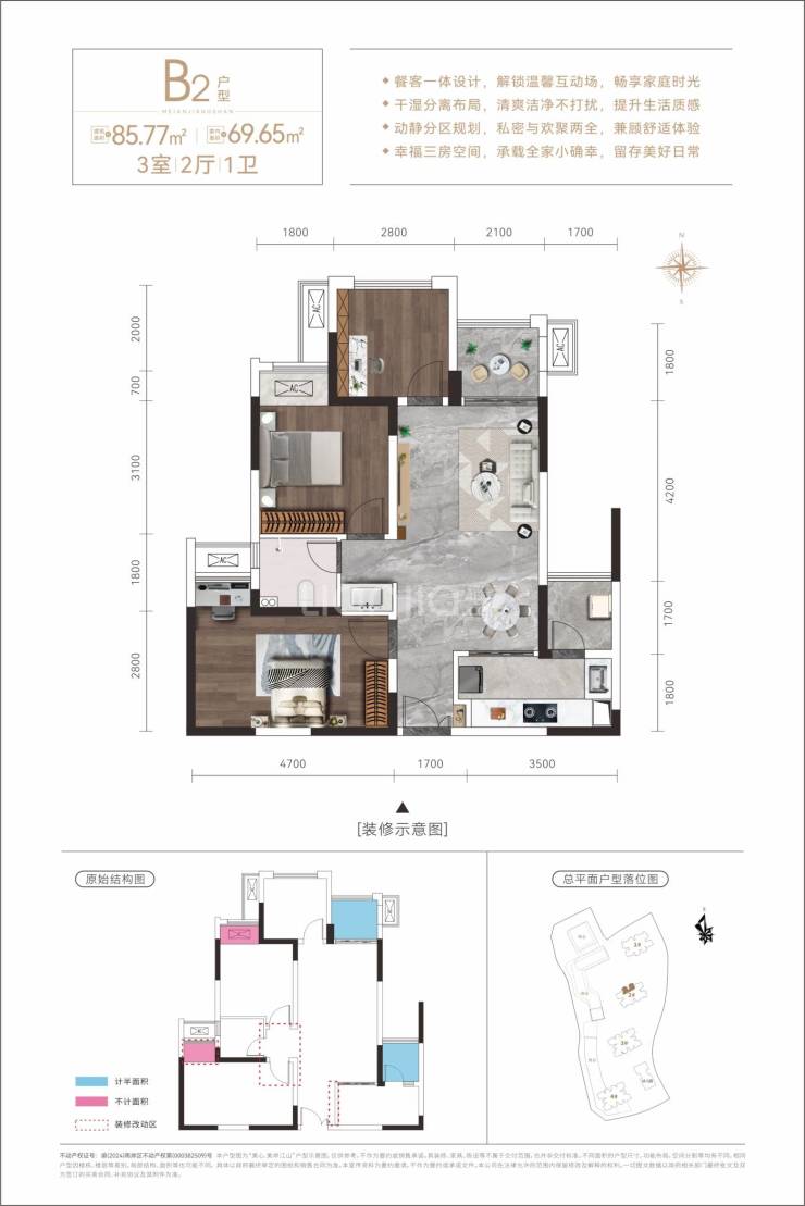建面约85平套三