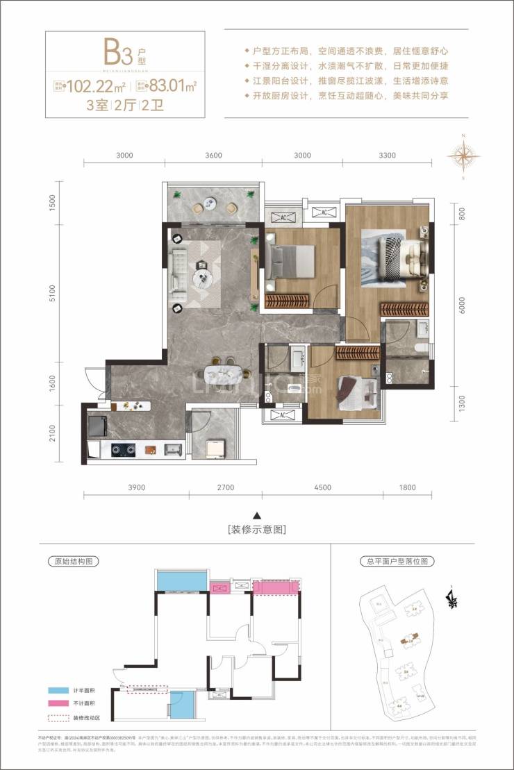 建面约102平套三