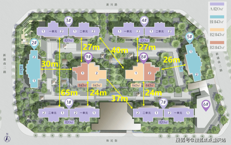 为了主采光面(客厅/主卧)对中庭,1/7栋朝北。不过,3个次卧朝南,有得有失。