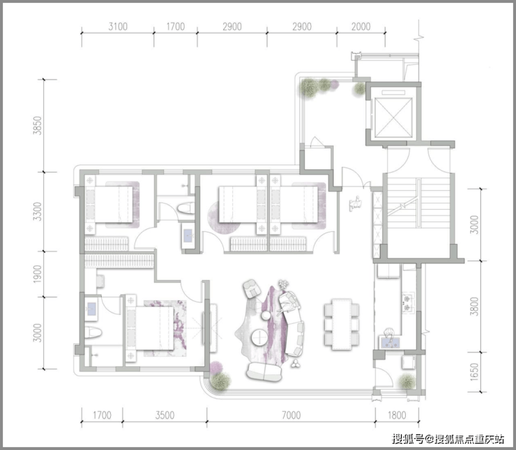 4开间朝中庭,双套房设计。次套房位于客厅另一侧,适合做老人房,减少起居习惯带来的互相干扰。