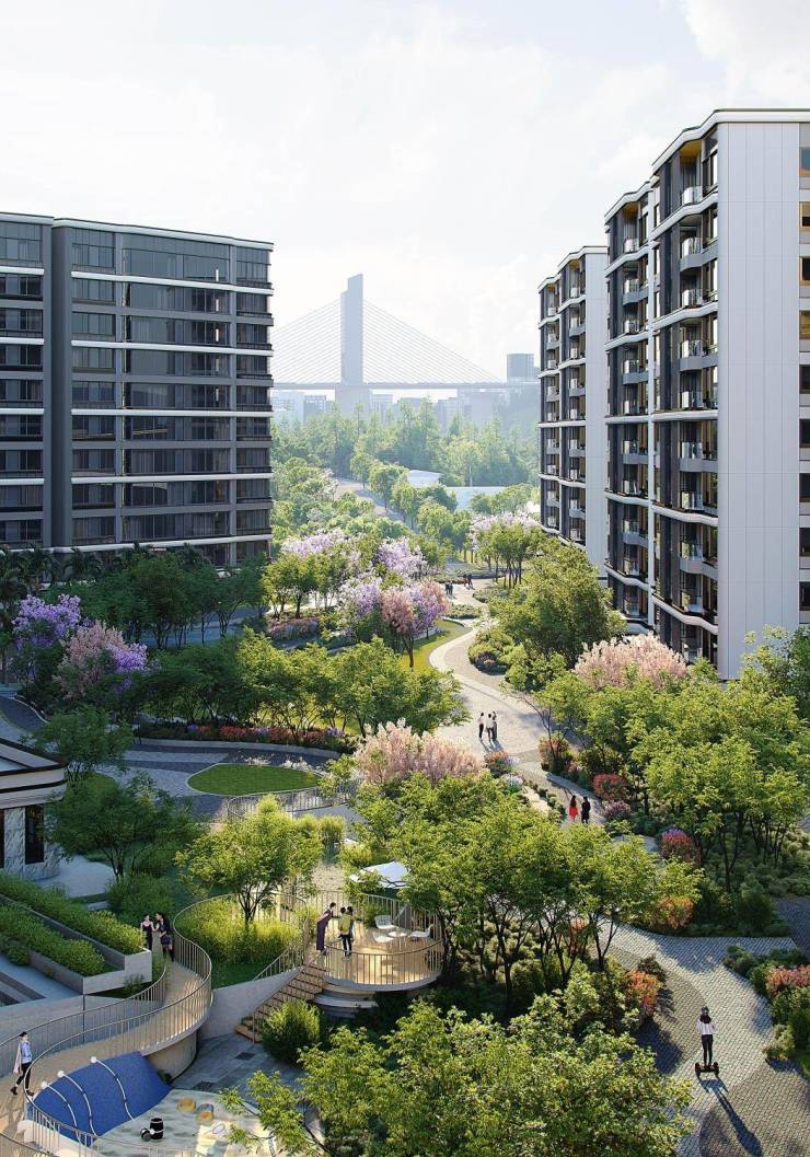 景观布局:以 “江的蜿蜒” 为设计灵感,打造多维景观空间,通过错落有致的布局与丰富绿植搭配,营造节奏感强的社区氛围,与江景自然相融;
