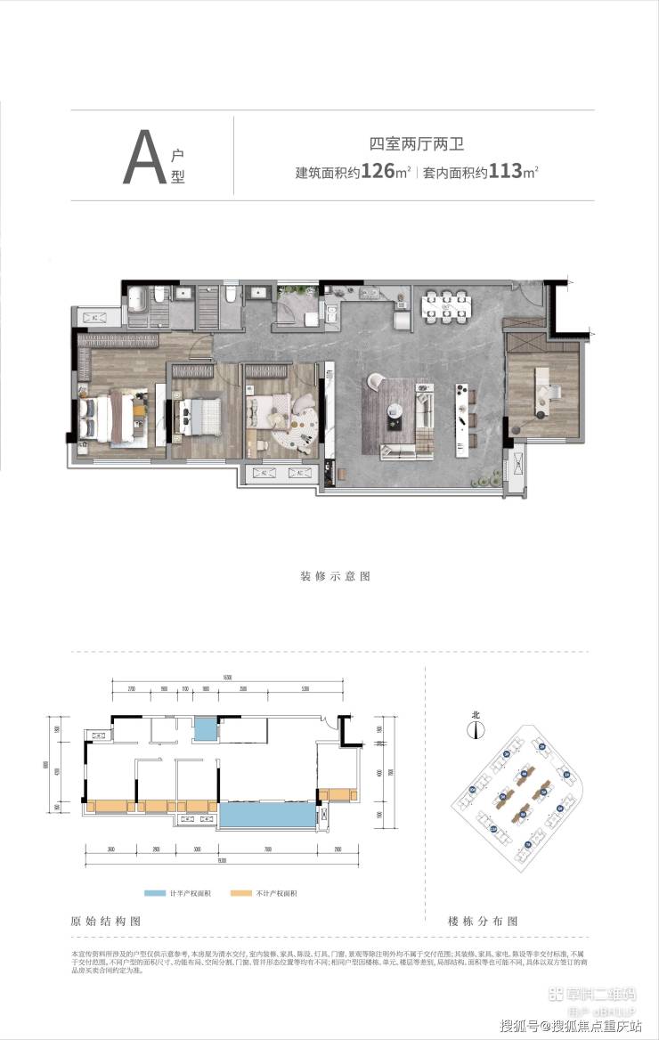 【总价】A户型:建面126㎡/套内113㎡,约128万