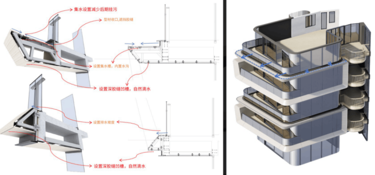 为了保持持久如新,还在铝板内部做了「集水设置」减少挂污。