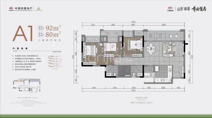 建面约92平套三