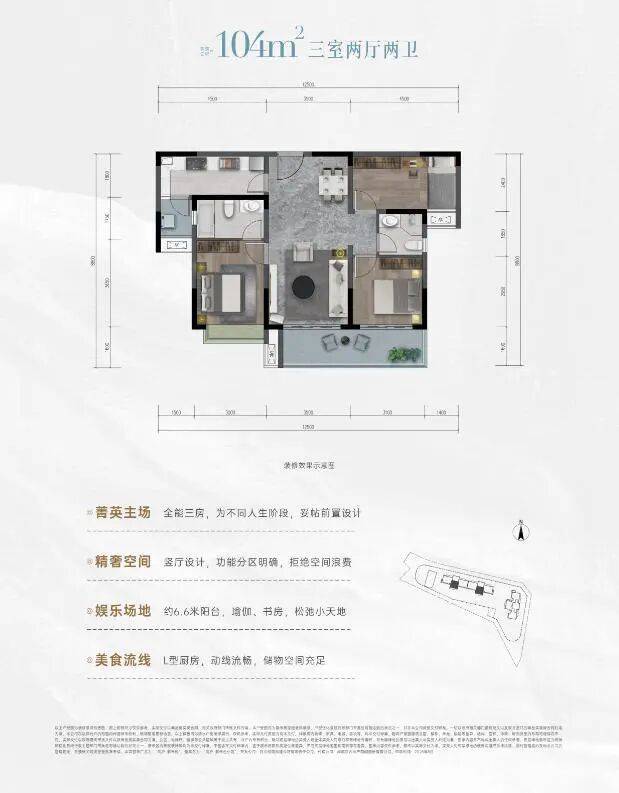 其中建面约104㎡和125㎡两种产品位于1号楼,南北朝向,北侧直面沪蓉高速和城东体育公园。