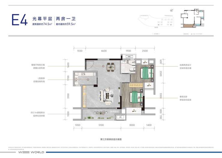 - E4户型建面约74.5㎡套内约59.5㎡