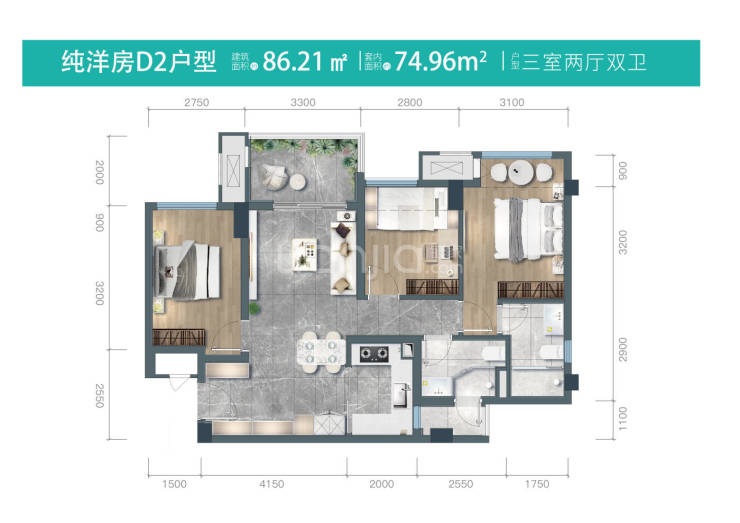 建面约86平套三