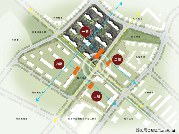 4期之间由市政道路、绿化和口袋公园有机连接,并统一规划打造为一座约200亩的高端低密度住区。