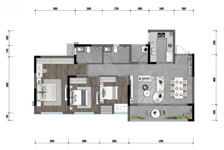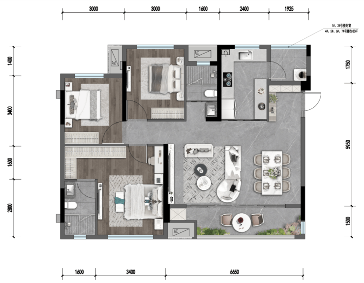 C:建面约101㎡,套内87㎡三室两厅两卫,得房率约100%