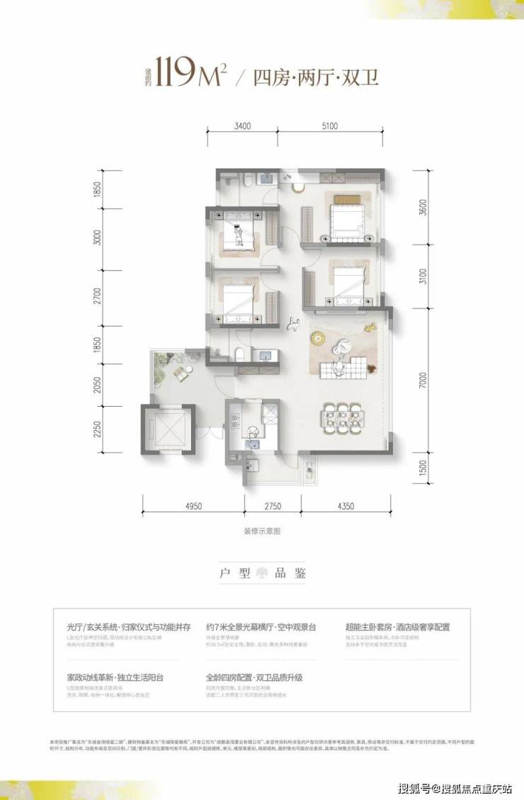 ⑥超享家庭厅——近 20 ㎡入户光厅+超 60 ㎡可视化方厅(含客厅、玄关、次卧改造开敞后)+约 8 ㎡景观阳台+约 8 ㎡明厨,实现九大功能场景