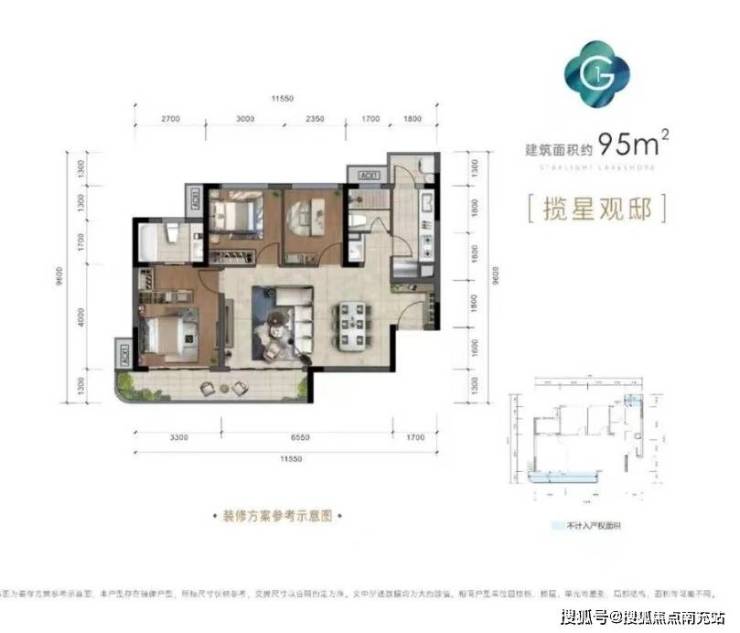 建面约95㎡,实得约106㎡套三双卫