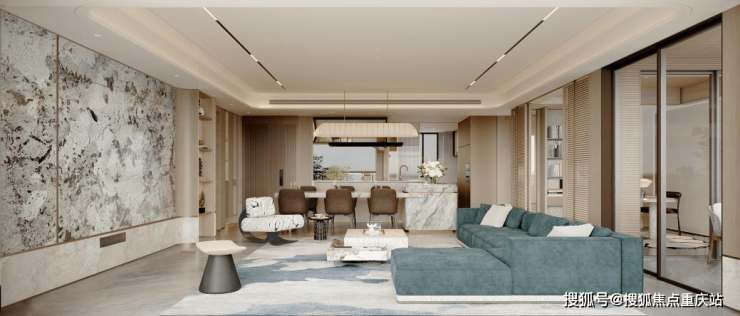 全屋色调雅致温馨,多种材质搭配和谐。软装设计搭配皮革、木质、岩石、贵金属,运用不同材质的交叠,与空间体量呼应。
