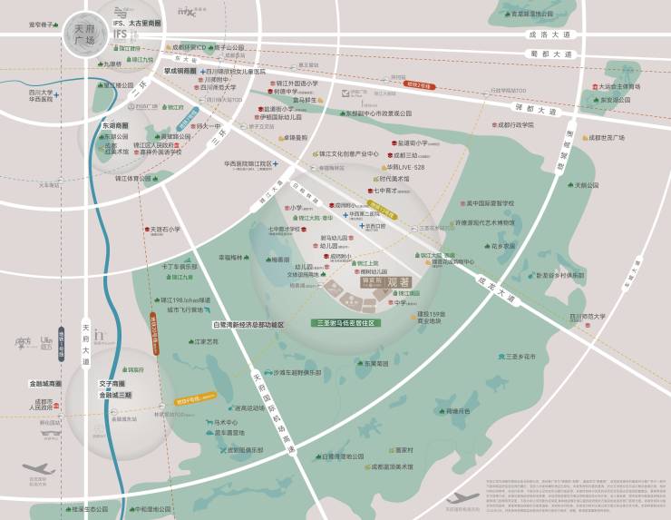 距金融城约6.5公里,距春熙路约8.5公里,与金融城,太古里-东大街构成「黄金三角区」;承接锦江向南,金融城向东发展的双向奔赴,高能产业聚集、繁华城市基底、低密留白规划、不可复刻生态,高净值人群聚落,让三圣乡成为全城仰望的奢宅新封面。