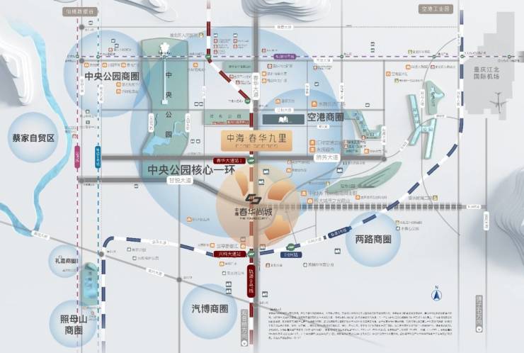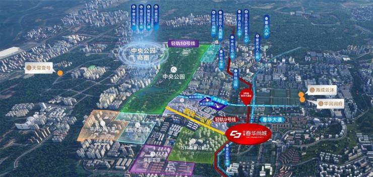 此项目坐落于重庆中央公园一环,春华尚城坐拥中央公园核心区1公里的景观资源。出门直线距离350米就能抵达黄金轻轨9号线的春华大道站点,距离公交车站兰馨大道中段仅100米,可直接享受成熟的城区配套。