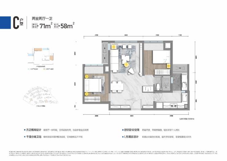 ◆拥有宽境横厅或方厅设计,社交、亲子、娱乐、办公等各类场景可轻松切换,同时通风采光效果极佳。