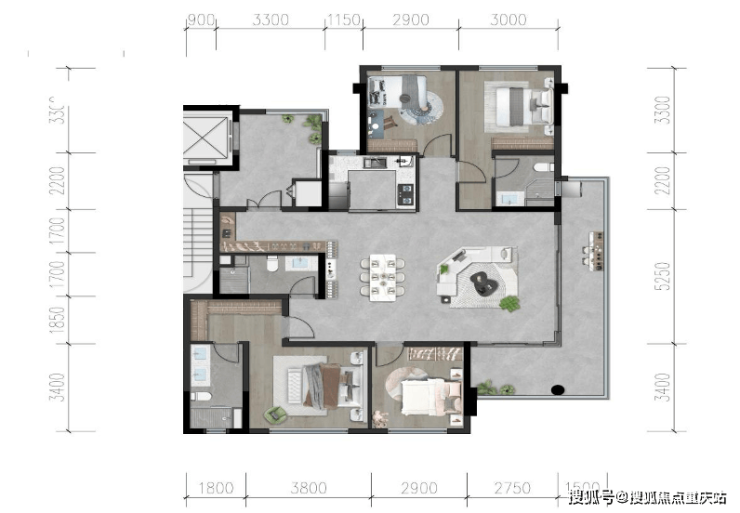 • 套四三卫双主卧,餐客厅一体化高达57m²,超宽两面客厅270度全景采光,在UP君印象中,以往这种设计只有在190m²/800w起的项目才可以看到;