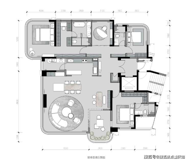 最出彩的还是主卧设计,除了基础的起居室、衣帽间和四分离主卫,主卧套房带一个休息区,外连景观阳台。整个套房尺寸近50㎡。