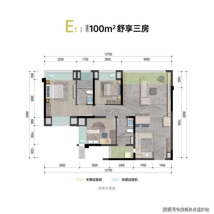 建面约100平套三