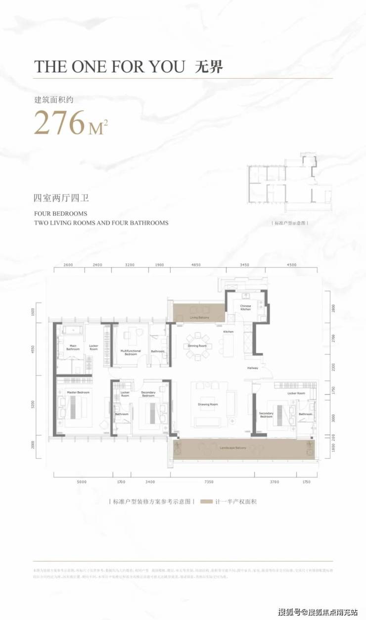 比如,276㎡户型阳台近13米,整个景观面南向开间近23米;最小181㎡户型阳台也约9.1米。