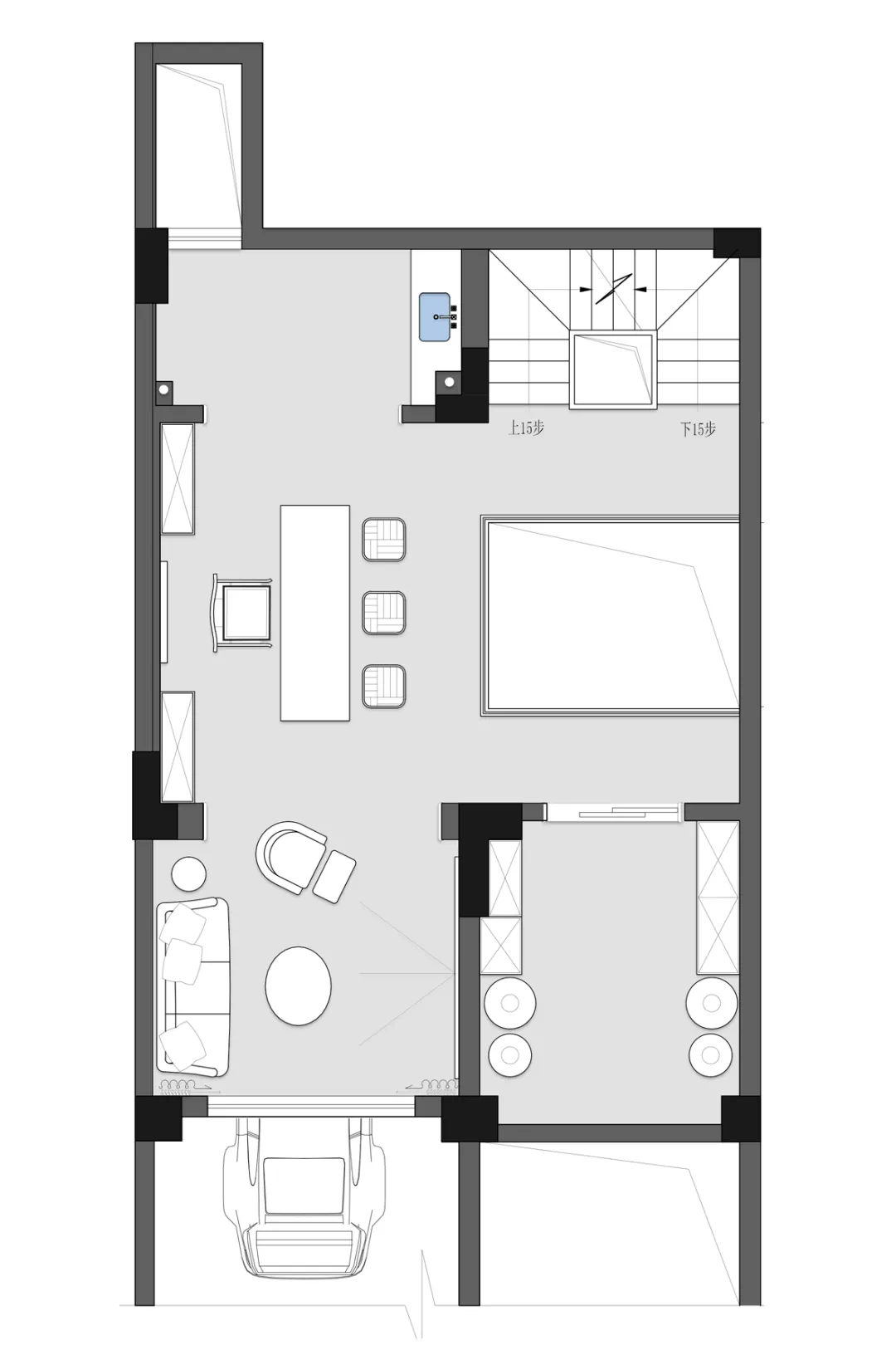 负二楼功能划分为日常生活区域:车库、杂物间等。
