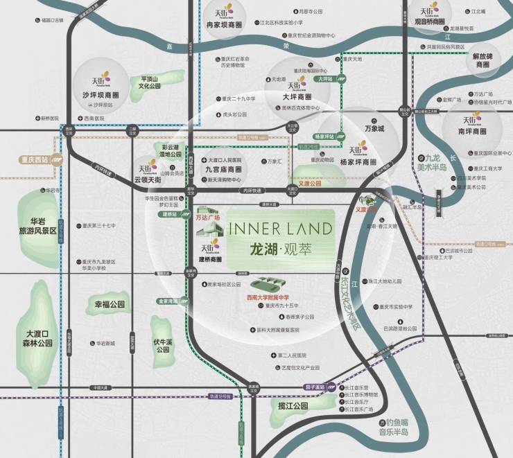 2、【区位最核心】以江城天街为核心,形成500亩龙湖纯改善大社区。步行可达商业,教育,轨道,滨江形成一公里黄金生活圈,观萃项目处于众多区域的中心位置。