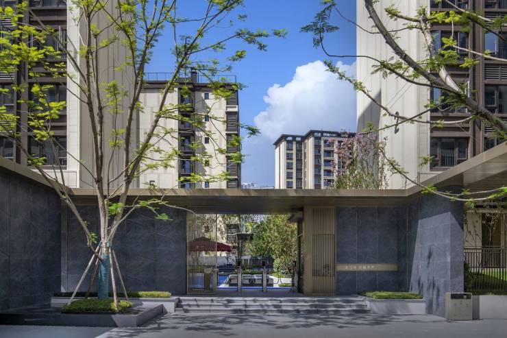 建筑风格以现代风为基调,围绕形体简约、设计现代、材料自然的三大特点,对北欧风情进行现代演绎,洋房外立面色彩以米黄色、咖色为主。园林景观由道远景观设计有限公司打造,采用金地独有的微气候智慧决策系统,打造了 “一环两轴四庭” 景观布局,还有三进归家体系,包括社区入户、水景归家、入户大堂。