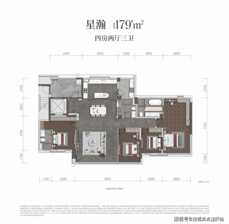 主力户型建面约179平米的户型更是热到“出圈”,在尺度、功能配置、舒适度方面展现出了突出的竞争力:户型采用了横厅设计,最大面宽达到了约20.8米,四卧室全部朝向“南向”主景观面;双套房三卫的设计,且三个卫生间均是“明卫”。值得一提的,建面约143平米户型也是双套房三“明卫”,将大平层的尺度感展现得淋漓尽致。