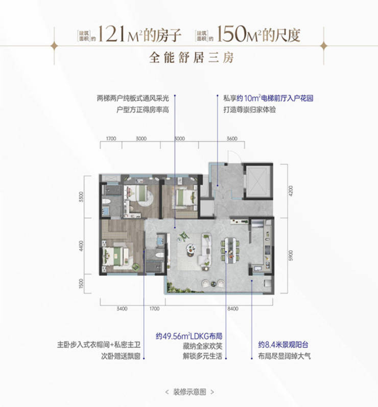 独立的电梯厅入户、私享入户花园、6.6米阔尺宽厅,8.4米景观阳台,版式通透、主卧步入式衣帽间+私密主卫,次卧均赠送飘窗,户型利用率高