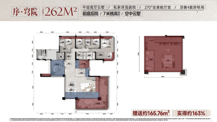 户型:建面 130/143/195/262㎡,143㎡起 2 梯 2 户板式;195/262㎡层高 3.5 米、客厅局部 7 米挑空;每层有 30-46㎡空中共享花园。