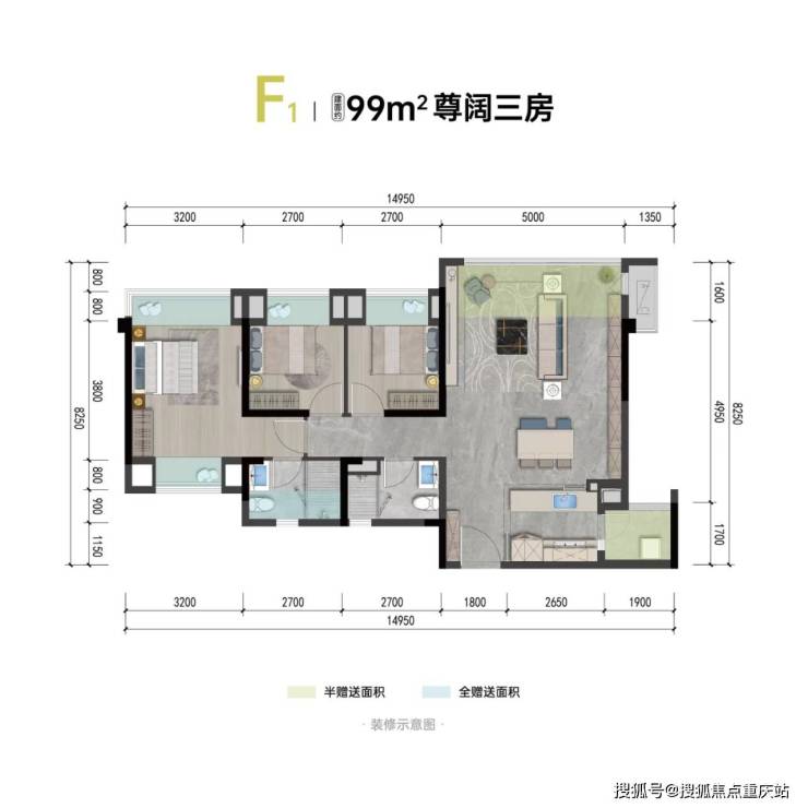 建面约99平套三