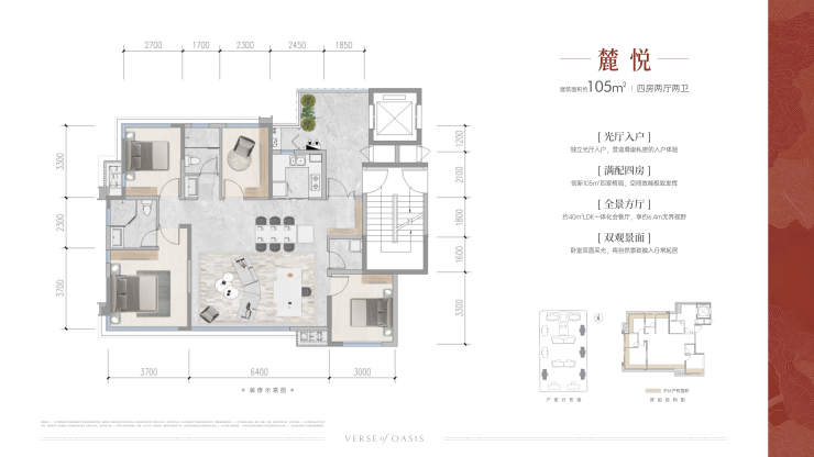 建面约105㎡,实得约119㎡四房两厅两卫,约15㎡独立光厅入户,联动厨房生活空间,约40㎡全景方厅,超20㎡奢阔主卧套房搭配全尺寸次卧