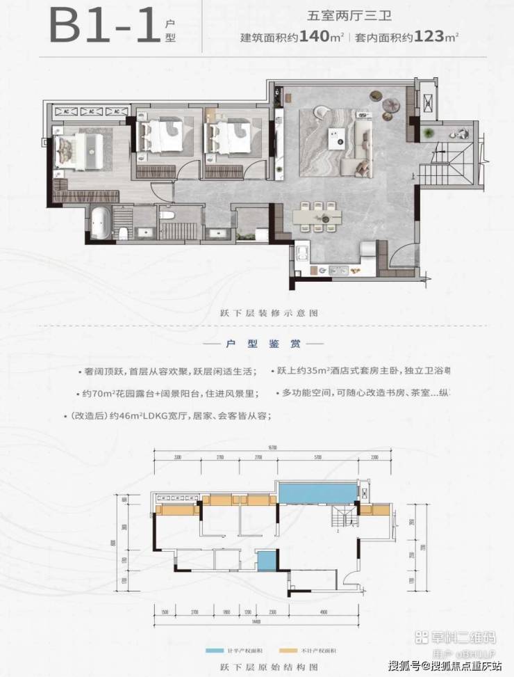 【总价】B1-1户型:建面140㎡/套内123㎡,仅一套约168万