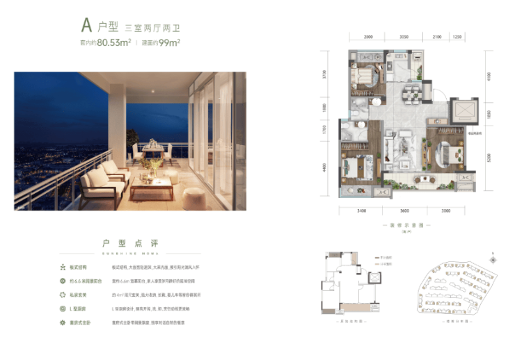 建面约99㎡ 套内约80.53㎡ 三室两厅两卫