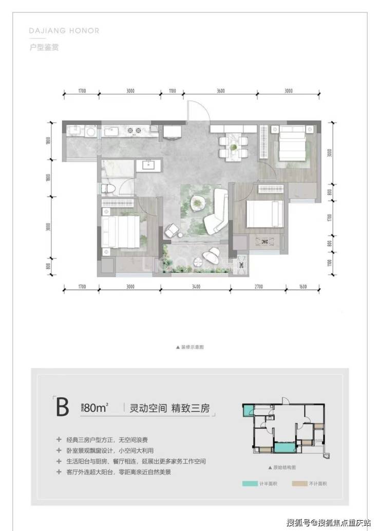 建面约80平套三