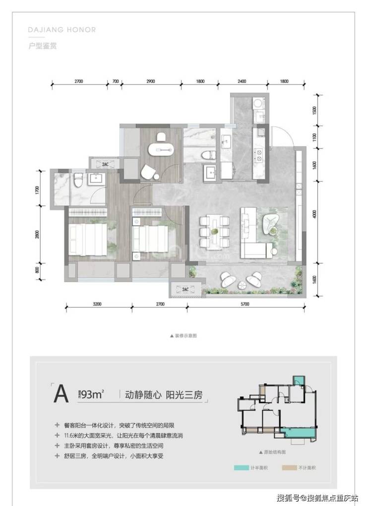 建面约93平套三