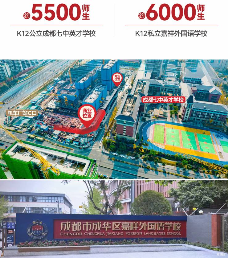 •一街之隔K12公立成都七中英才学校近5500师生,700米内K12私立嘉祥外国语学校约6000师生,双校覆盖从小学到高中全龄段教育,师生规模超万人,形成稳定、高粘性、强复购的消费主场。