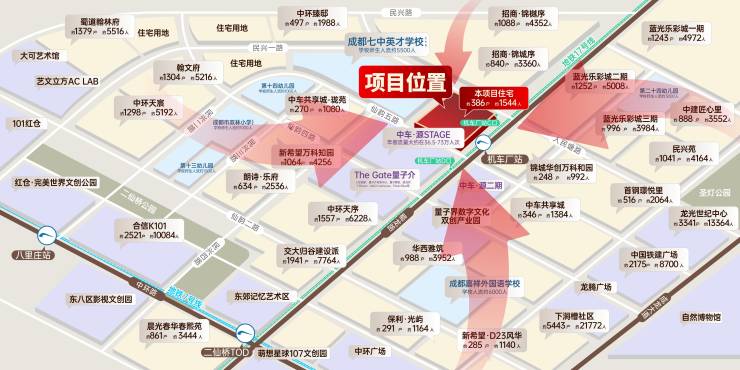 •项目1.5公里内有机车厂、二仙桥、八里庄、十里店四个地铁站点,最近的17号线机车厂站C口出站即达项目,是周边众多小区、七中英才学校前往地铁站的必经之路,人群来往不绝。