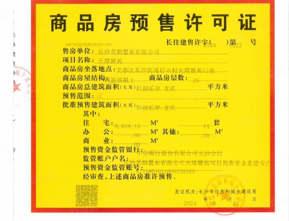 - 长住建售许字(2024)第0222号 详情发证时间 2024-09-23绑定楼栋12#证件照片