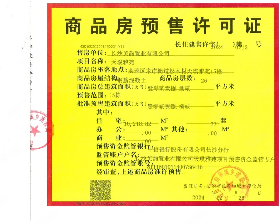 - 长住建售许字(2024)第0313号 详情发证时间 2024-12-26绑定楼栋15#证件照片