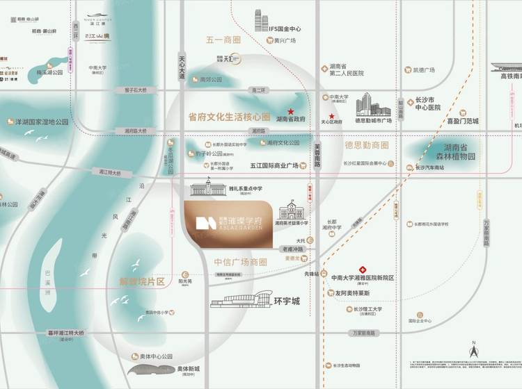 直线3km范围内有46个幼儿园;14个小学,如长郡外国语第一附属小学、蓝天小学、湘府英才益清小学、湘府英才小学、仰天湖中建小学等;5个中学:长郡外国语实验中学、雅礼融城学校、长沙市长郡湘府中学、湖南师大附中双语树人学校、中雅培粹学校(新校区)。