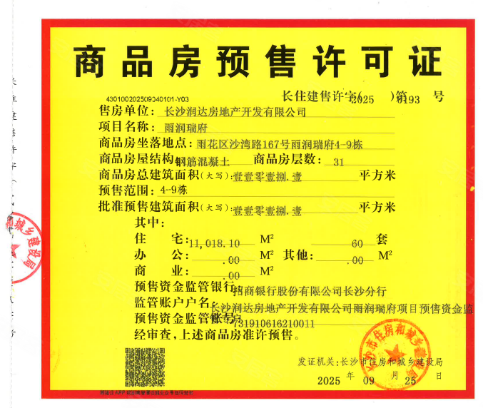 - 长住建售许字(2025)第0193号 详情发证时间 2025-09-25绑定楼栋四期9#证件照片
