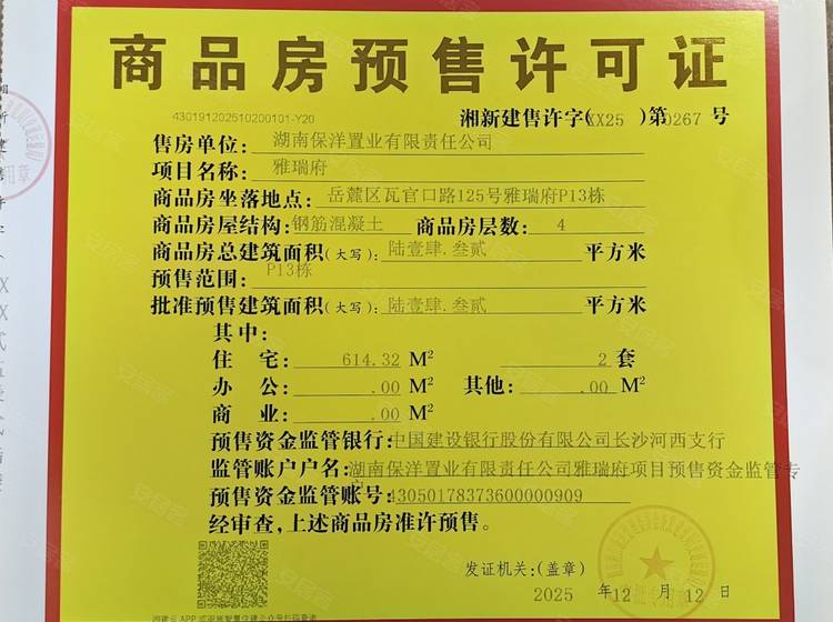 - 湘新建售许字(XX25)第0267号 详情发证时间 2025-12-12绑定楼栋P13#证件照片