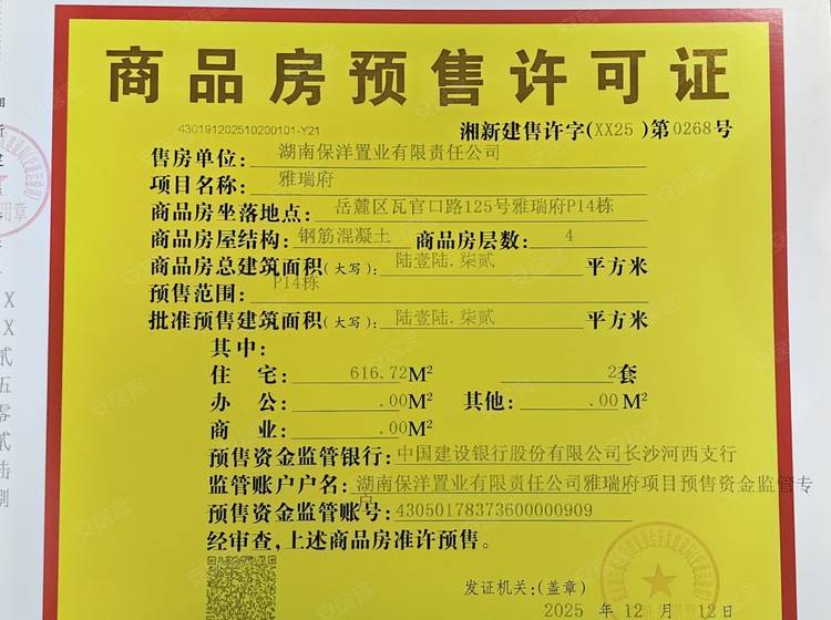 - 湘新建售许字(XX25)第0268号 详情发证时间 2025-12-12绑定楼栋P14#证件照片